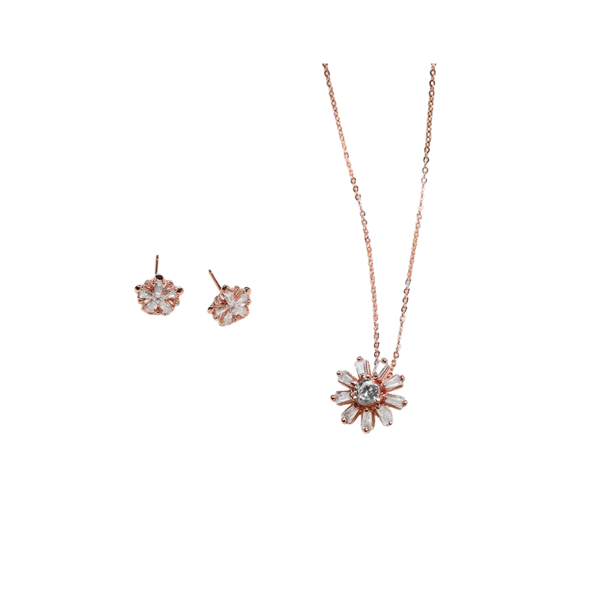This Rose Gold Baguette Flower Set is handcrafted with love, just for YOU! Featuring a sparkling zircon centrepiece nestled within baguette petals, the pendant and earrings are pure joy. The rose gold finish simply adds to its charm.
